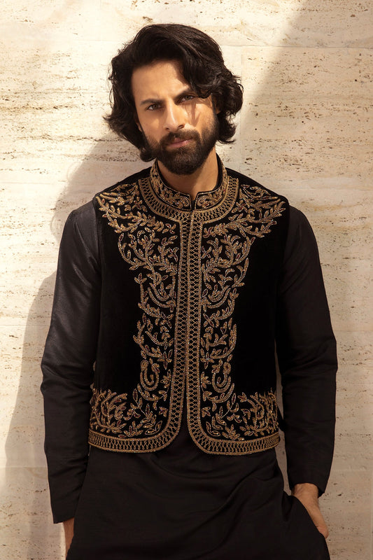 Black Velvet Waistcoat with Gold Embroidery Pathani Kurta Set