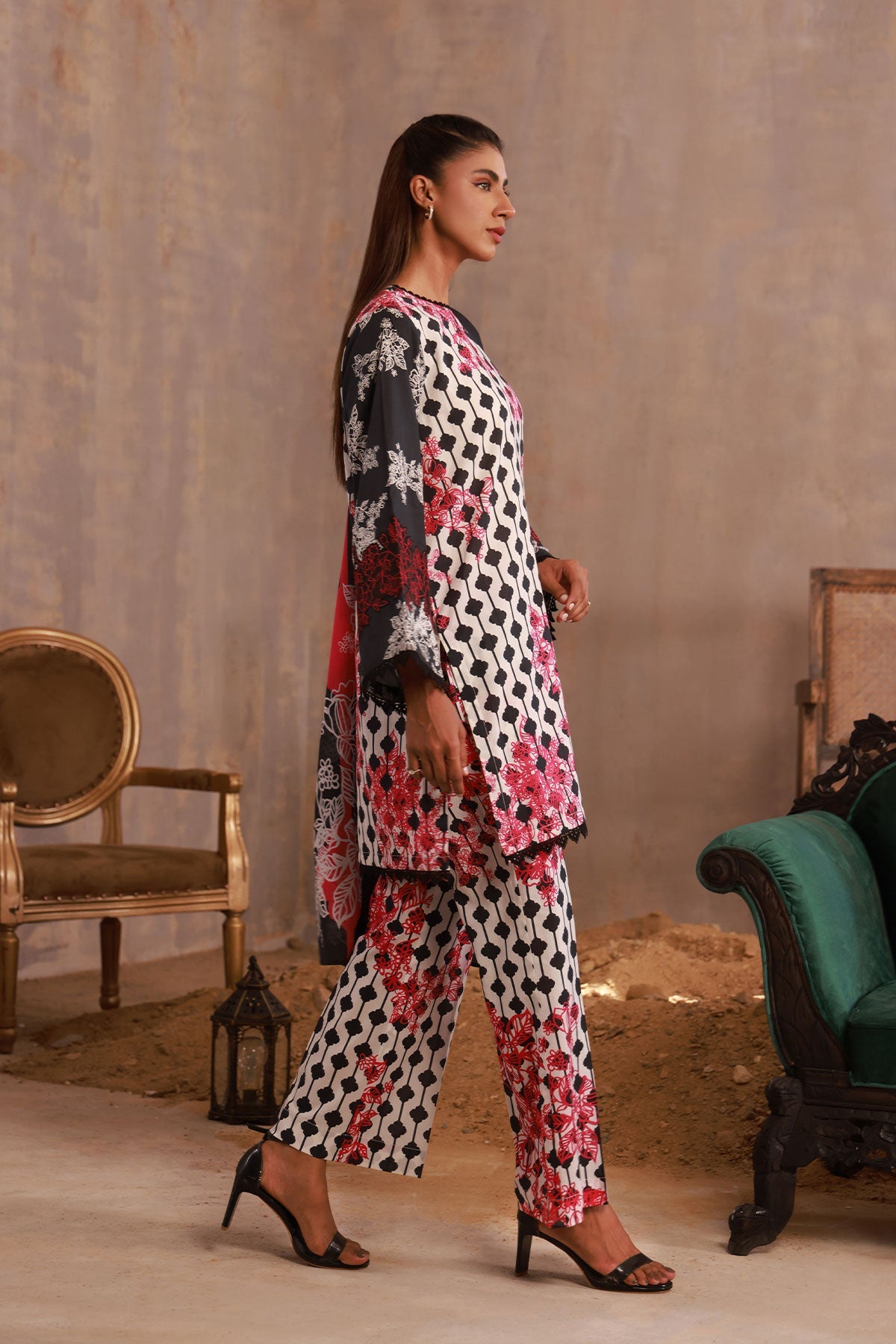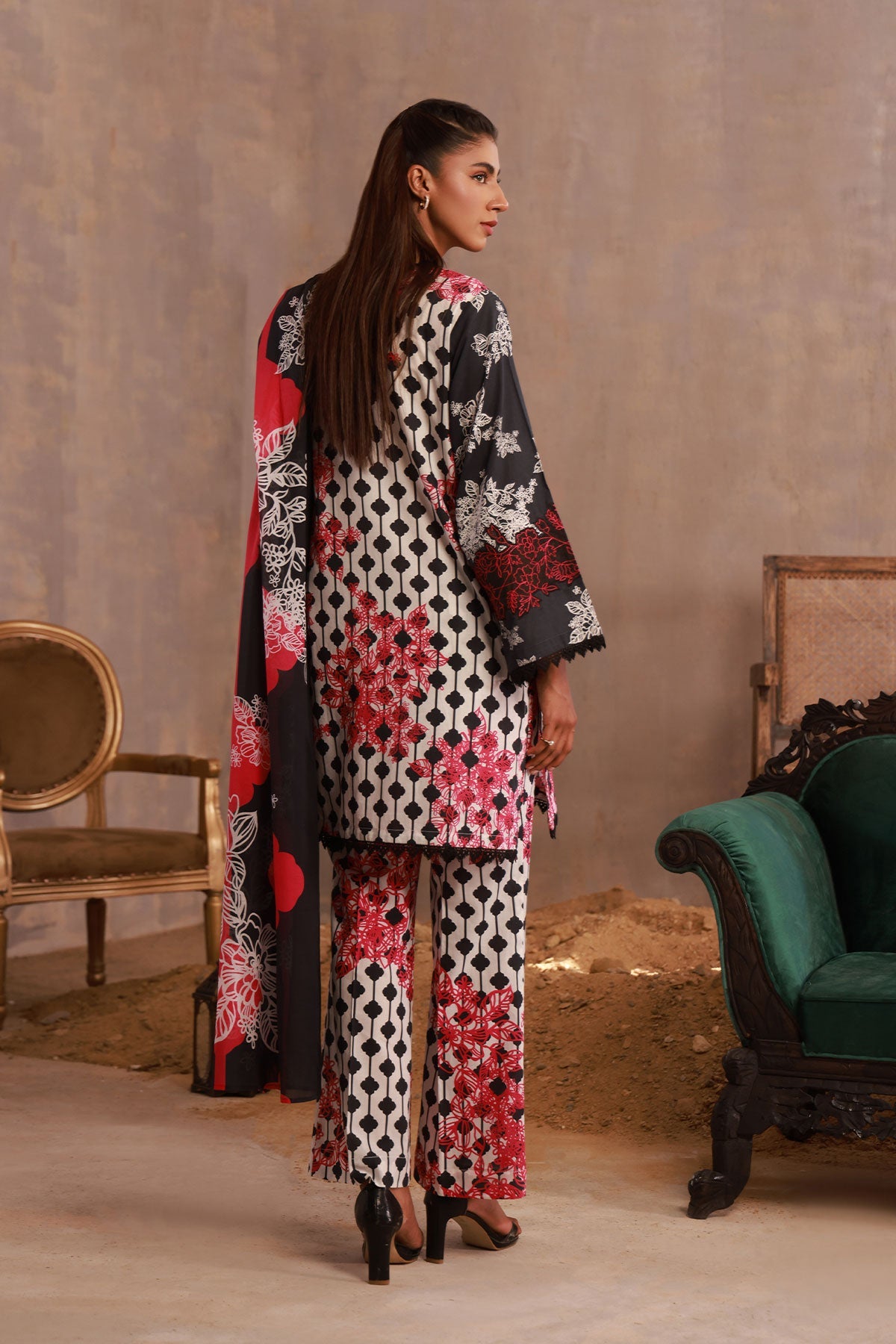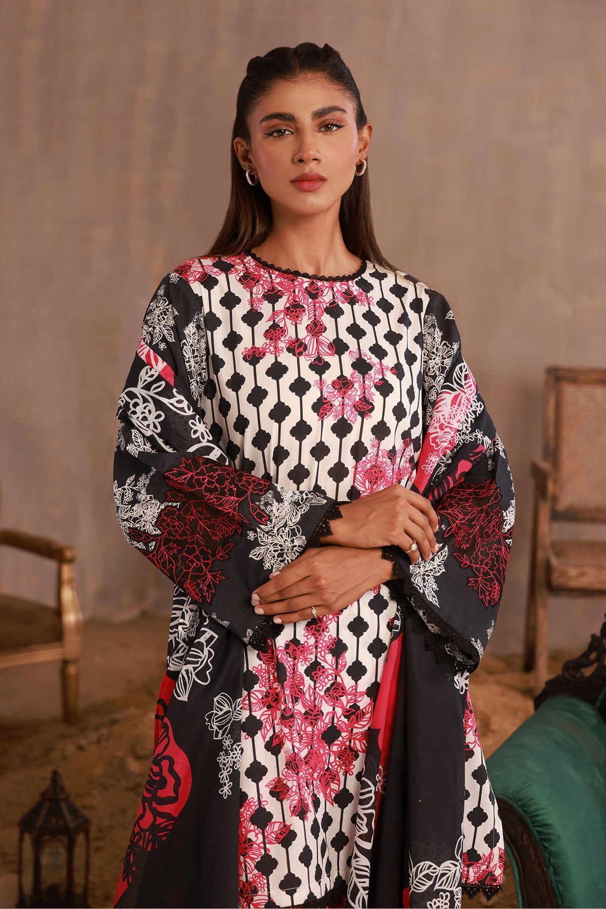 3PC WHITE COLOR CAMBRIC SHIRT EMB ON SLEEVES WITH LACES PRINTED TROUSER PRINTED DUPATTA