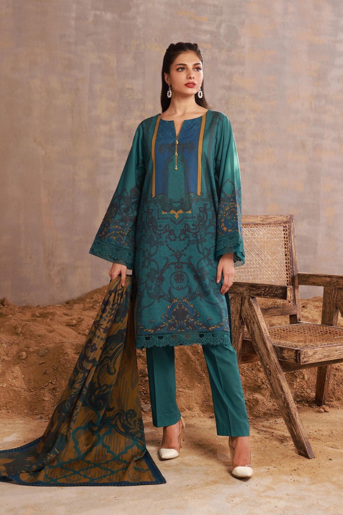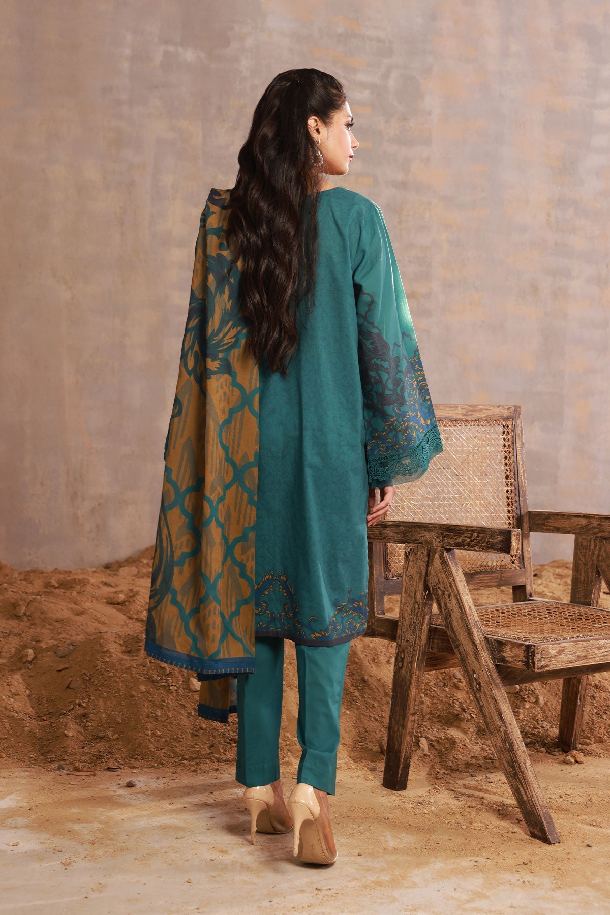 3PC TEAL COLOR CAMBRIC SHIRT DYED TROUSER DYED ORGANZA WITH LACES PRINTED DUPATTA