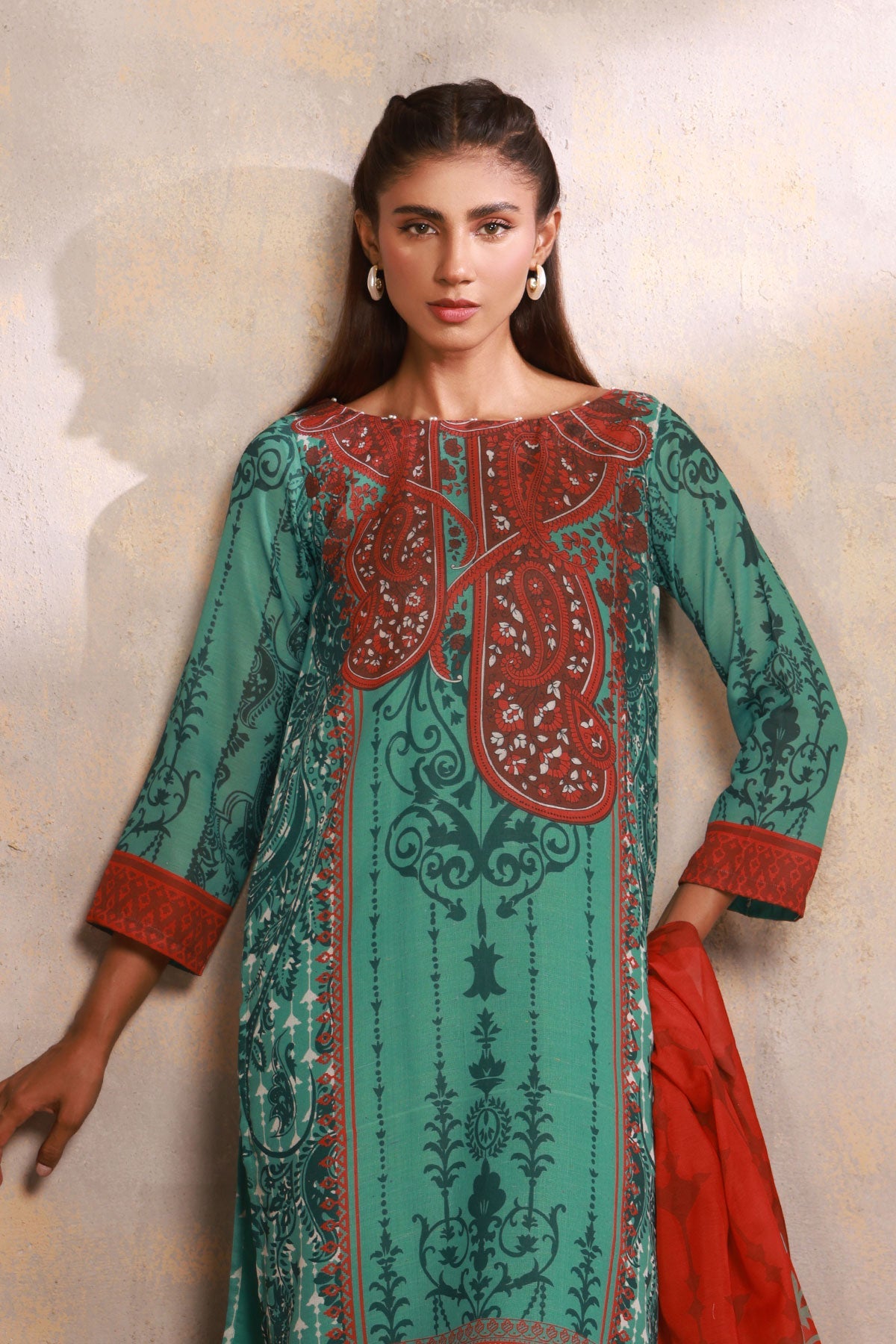 3PC GREEN COLOR SLUB LAWN SHIRT WHITE CAMBRIC TROUSER PRINTED DUPATTA